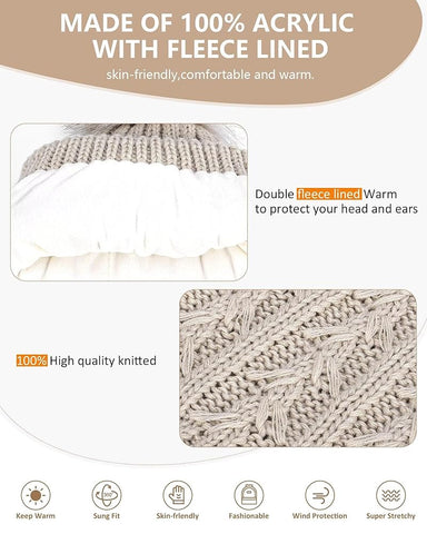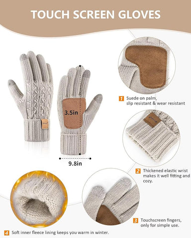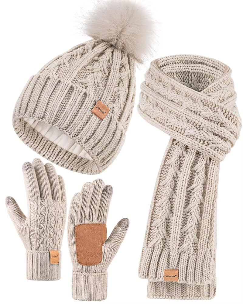Womens Beanie Hat Scarf Gloves Set, Fleece Lined Winter Hat with Pom Pom, Long Knit Scarf Touchscreen Gloves for Cold Weather